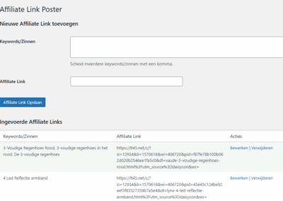Dit betreft een eigen ontworpen affiliate link poster. Dit script / wordpress plugin is geschikt om ervoor te zorgen dat bepaalde woorden of zinnen in je berichten automatisch worden vervangen door affiliate links. Dit betekent dat als je een keyword of zin in een bericht gebruikt en je hebt daar een affiliate URL aan gekoppeld, de plugin dit woord vervangt door een klikbare link naar dat affiliate product.