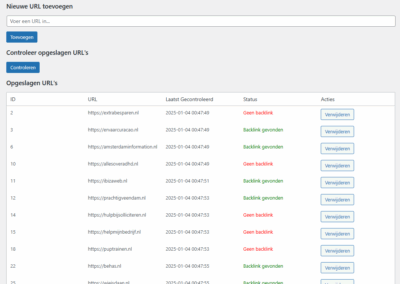 ● Mogelijke statussen: Geen backlink, Backlink gevonden en nog niet gecontroleerd.