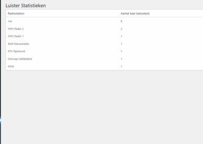 Deze pagina toont per radiostation het aantal keer dat er op is geklikt (geluisterd). Hiermee krijg je inzicht in de populariteit van de verschillende stations.