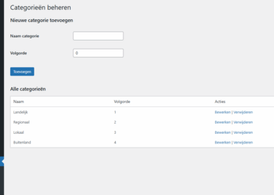 Hier kun je nieuwe categorieën aanmaken en bestaande categorieën wijzigen of verwijderen. Voor elke categorie geef je een naam en een volgorde op, zodat je de weergave op de frontend kunt bepalen.