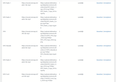 Onder het formulier zie je een tabel met alle radiostations, inclusief de toegewezen categorie en volgorde. Hier kun je bewerken of verwijderen.