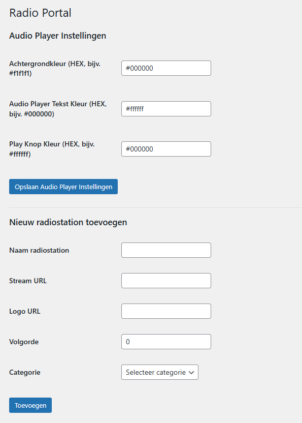 - Shortcode: Gebruik de shortcode [radio_portal] om het radio portal op een pagina weer te geven.