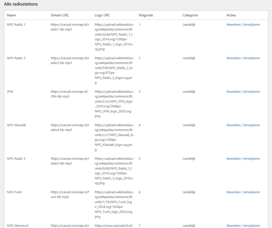 Onder het formulier zie je een tabel met alle radiostations, inclusief de toegewezen categorie en volgorde. Hier kun je bewerken of verwijderen.